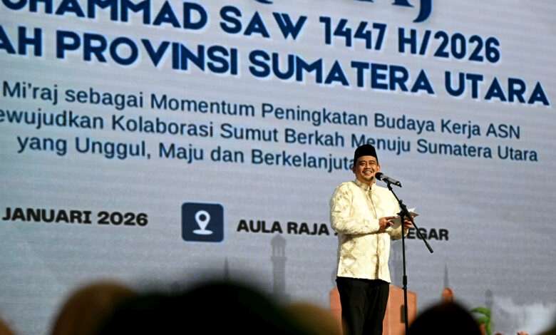 Harapan tersebut disampaikannya dalam Peringatan Isra Mikraj Pemerintah Provinsi (Pemprov) Sumut 1447 Hijriah yang digelar di Aula Raja Inal Siregar (RIS), Kantor Gubernur Sumut, Rabu (21/1/2026), dengan tema “Momentum Peningkatan Budaya Kerja ASN Berakhlak untuk Mewujudkan Kolaborasi Sumut Berkah Menuju Sumatera Utara yang Unggul, Maju dan Berkelanjutan”.
